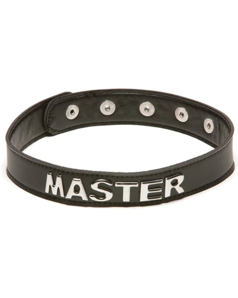 Voilà un collier ras de cou avec le mot master indiqué en lettres argentées. Tour de cou de 32 à 42cm. En simili (polyuréthane)