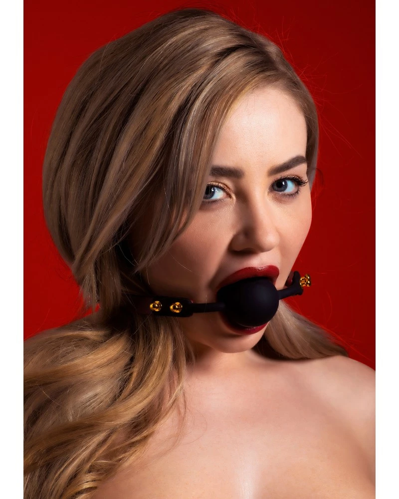 Cet accessoire de la marque Taboom est un bâillon conçu avec une boule en silicone de 4cm de diamètre.Avec des sangles en simili cuir rouge qui s’ajustent derrière la tête.Avec les attaches en métal doré