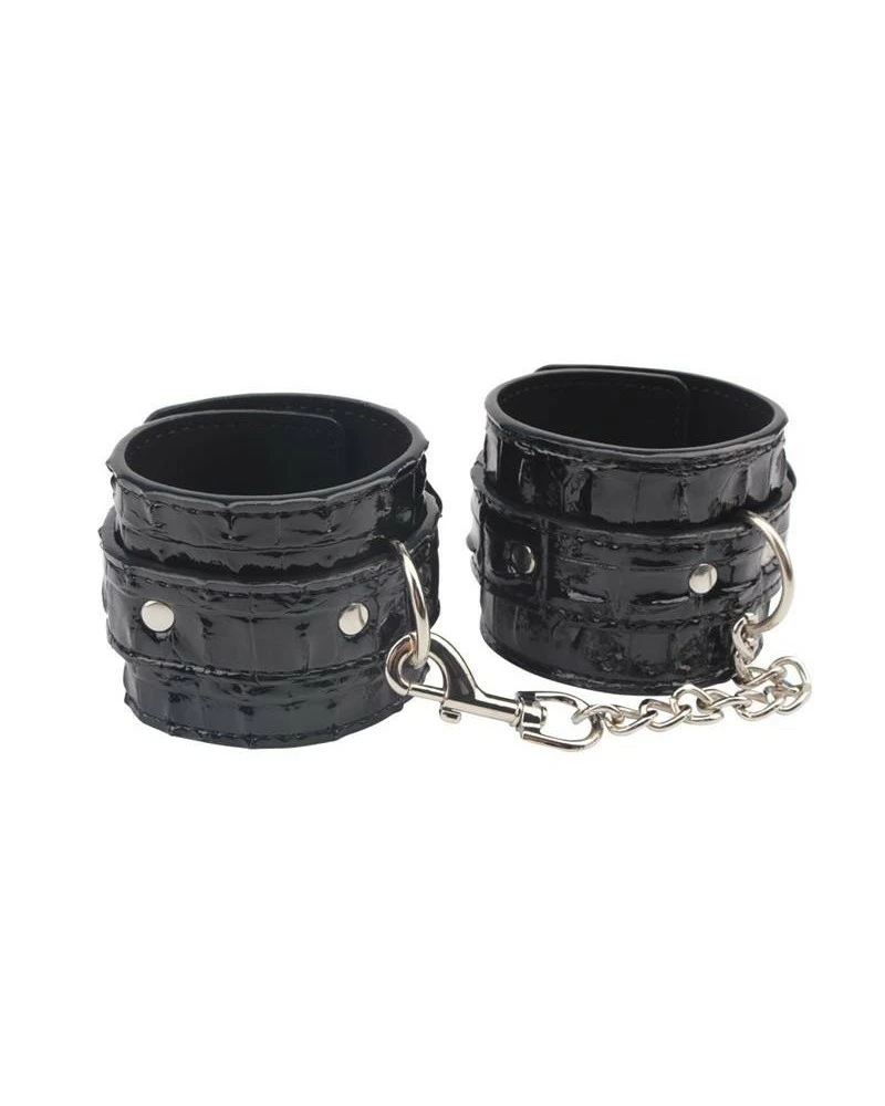Ces menottes Surrender Behave de la marque Chisa Novelties sont idéales pour bloquer l’usage des bras du partenaire.Elles sont réalisées avec des boucles noires à l’effet brillant et avec une matière imitant le cuir.Les attaches sont en métal, ainsi que la chaîne qui relie les deux menottes. Fabriquées en polyuréthane
