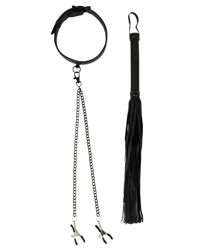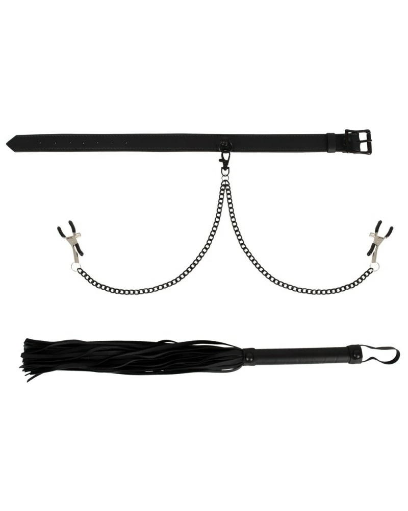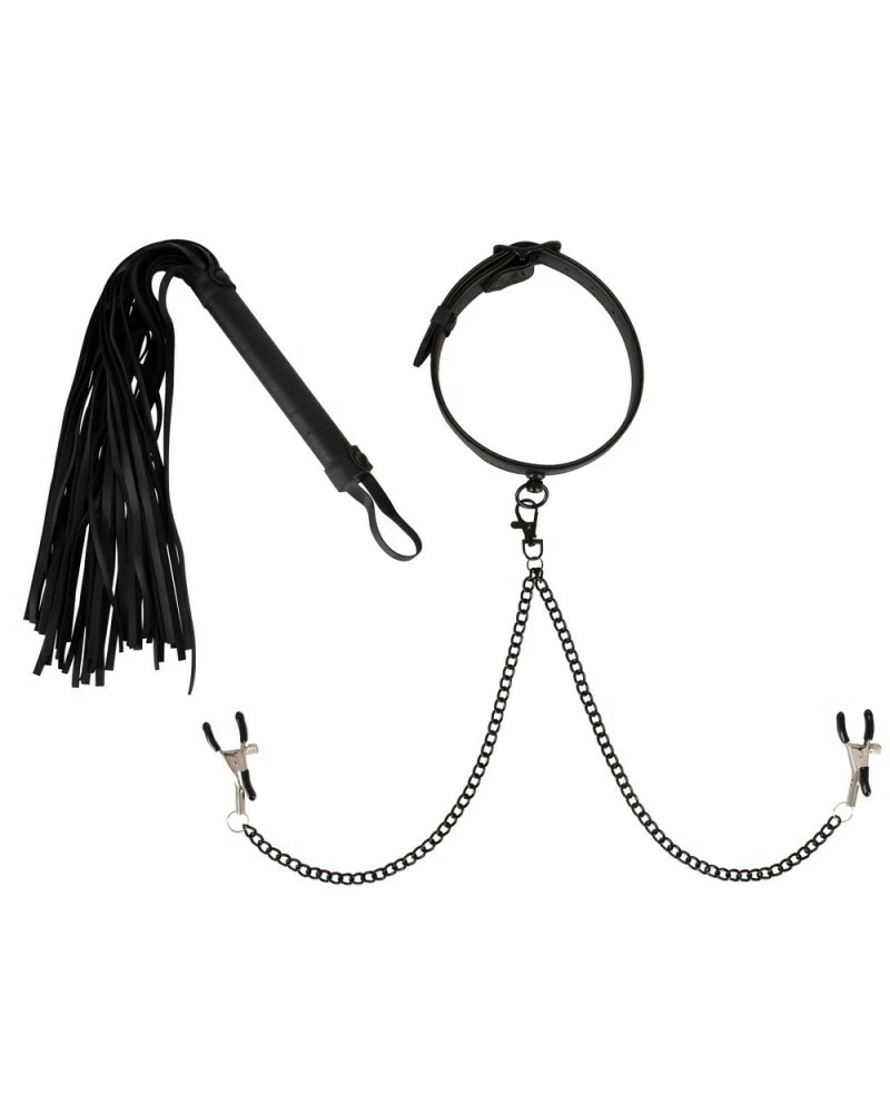 Cet ensemble est composé d’un collier avec des pince-tétons. Les chaînes en métal sont de 30cm. Le collier mesure 2.5cm de largeur. Le tour de cou va de 34 à 46cm.Avec un martinet. Fabriqué en polyuréthane (sans origine animale)