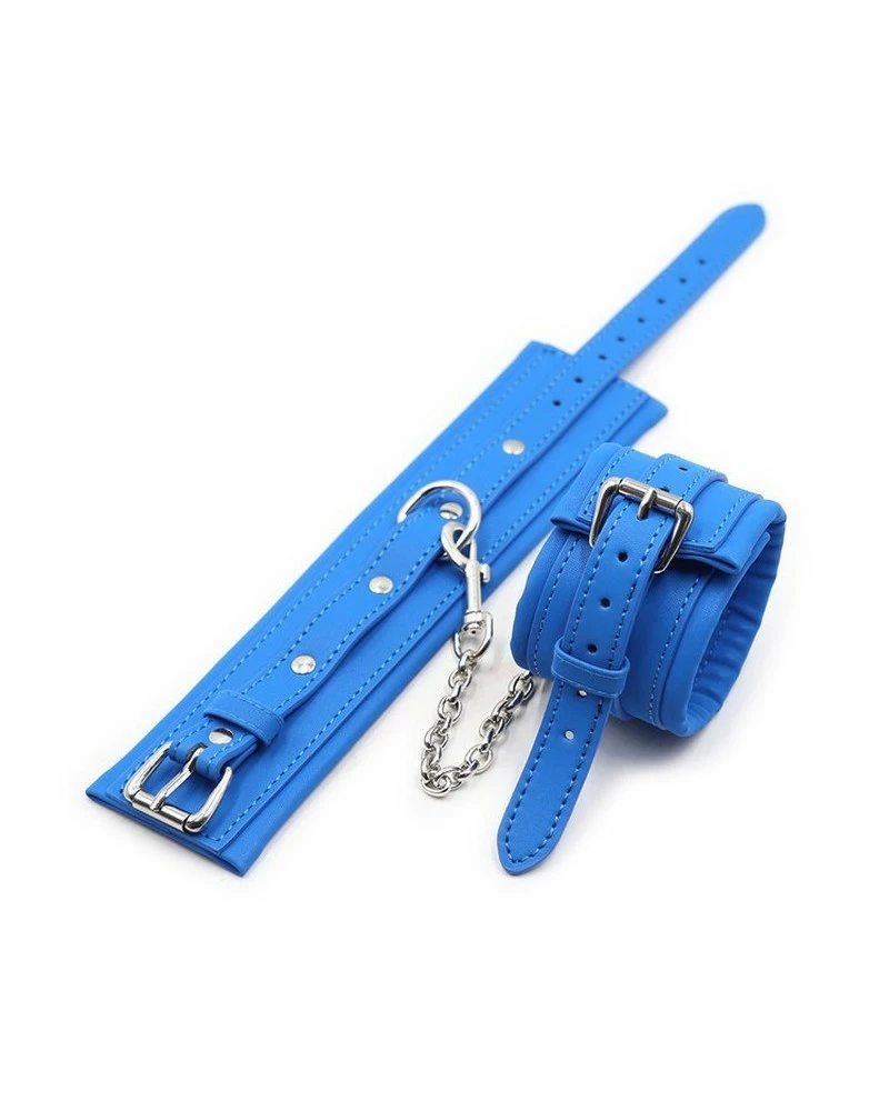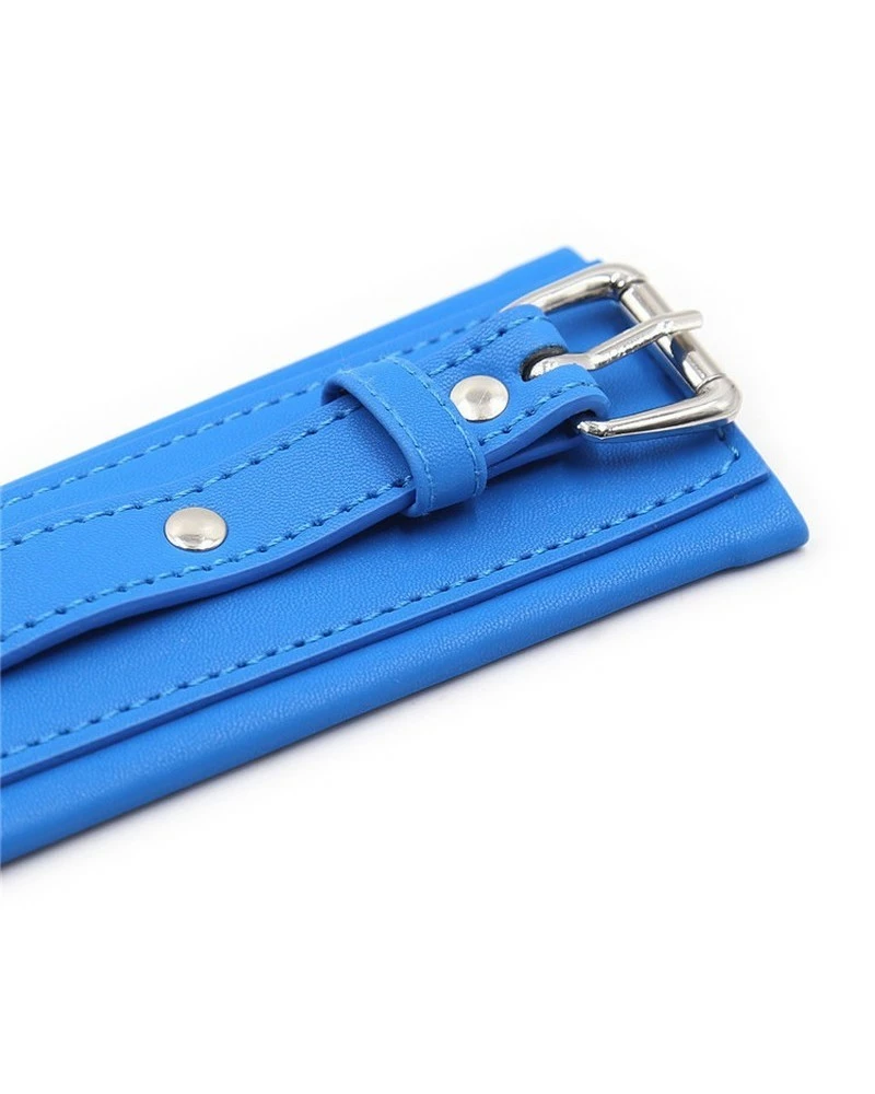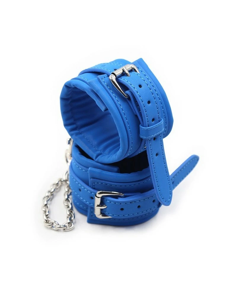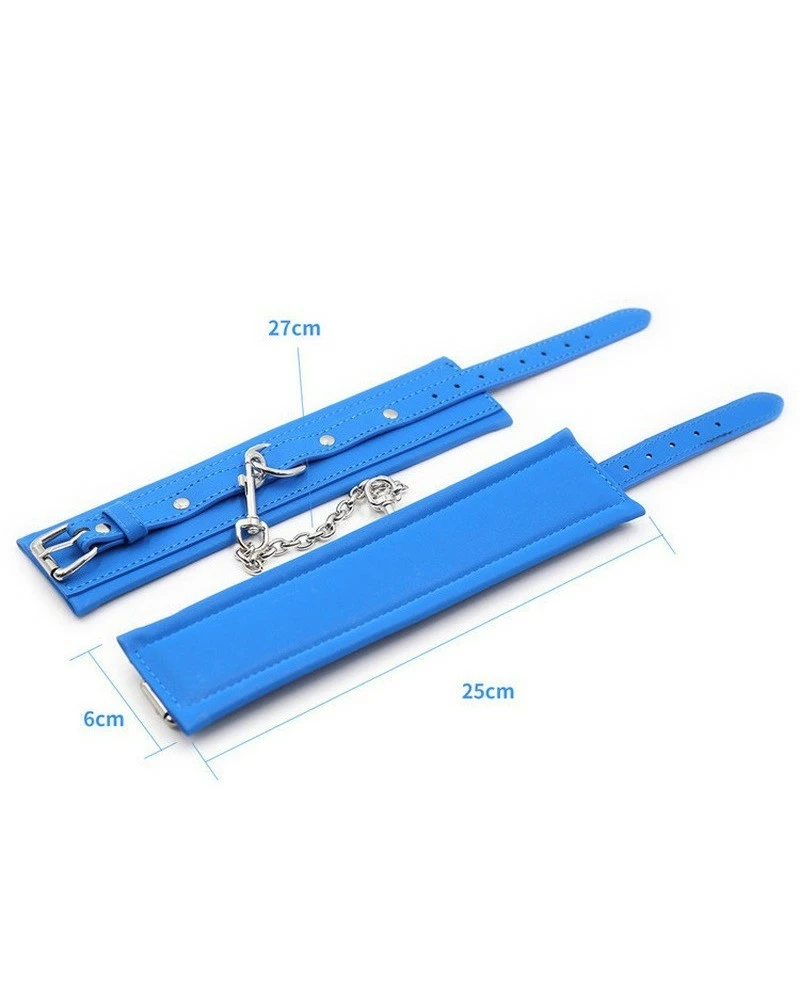 Ces menottes bleus sont des accessoires SM idéals pour les jeux de soumission.Elles permettent d’attacher le partenaire et de garder le contrôle sur lui. Réalisées en matière simili cuir avec des attaches ajustables et une chaîne de 27cm