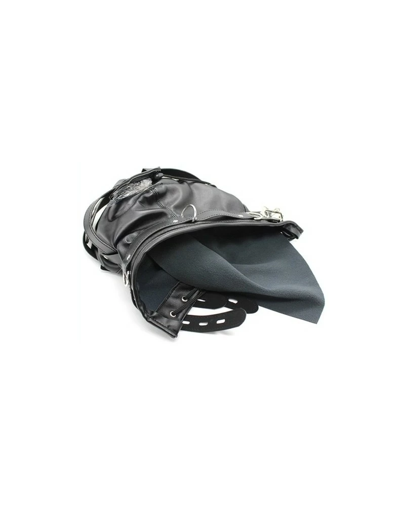 Cette cagoule est idéale pour empêcher le partenaire de tout usage des sens.En effet, elle dispose de caches pour les yeux et la bouche. Ils sont amovibles et peuvent se bloquer avec les cadenas. Les contours des yeux et de la bouche sont formés par des anneaux métalliques.Cagoule ajustable avec les cordons à l’arrière. Fabriquée en simili (polyuréthane)