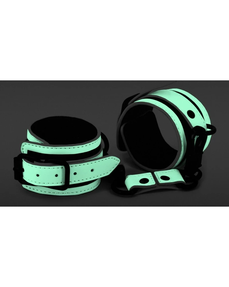 Ces menottes de poignets brillent dans le noir. Elles permettent d’attacher les mains et rendre le moment SM plus original.Largeur de 4.5cm. Tour facilement ajustable. En polyuréthane
