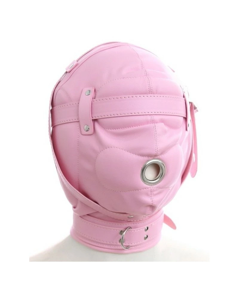 Une ouverture est présente au niveau de la bouche pour permettre à votre partenaire de respirer librement. La cagoule est faite avec des sangles et des cordons à la taille de la tête ajustables. Un revêtement en simili cuir rose complète l’ensemble.