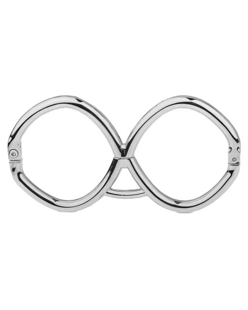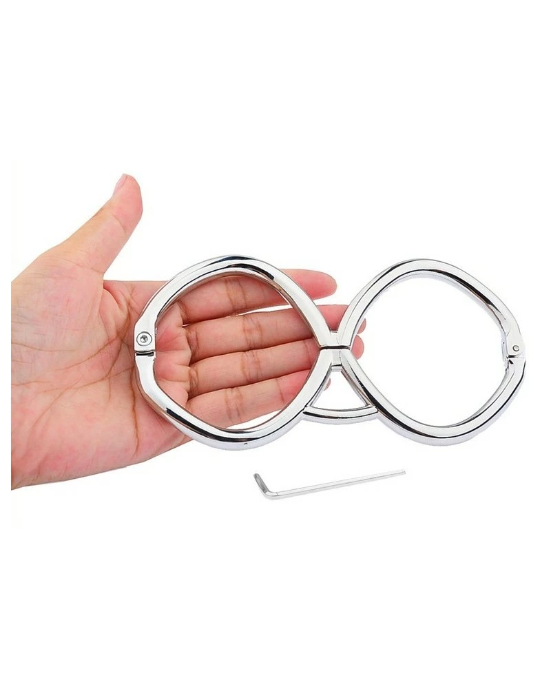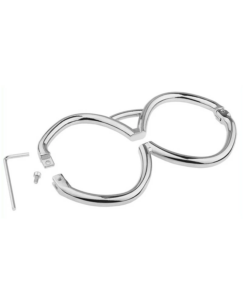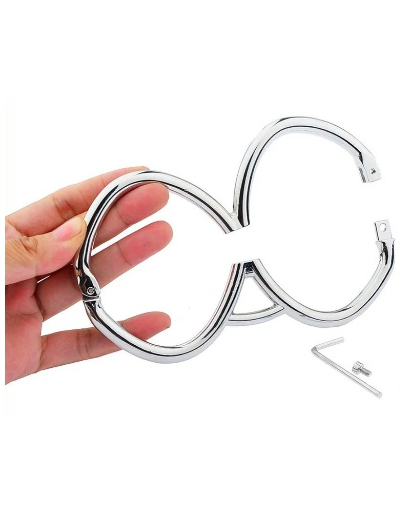 Ces menottes en métal Hex sont conçue d’un seul tenant avec 2 anneaux de 6cm de diamètre se fermant directement sur les poignets.La longueur est de 15cm.La fermeture se fait avec une clé allen (fournie). Épaisseur de 8mm.