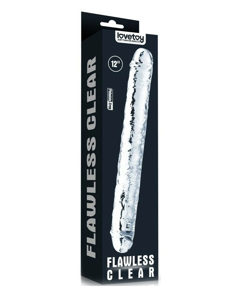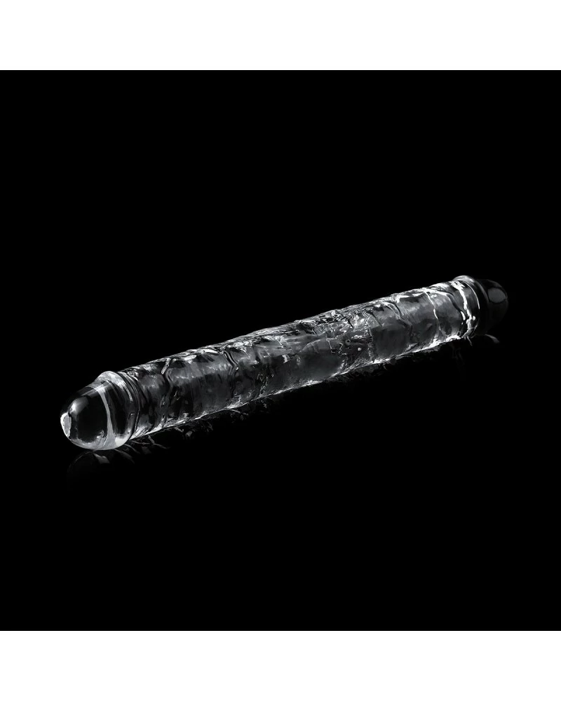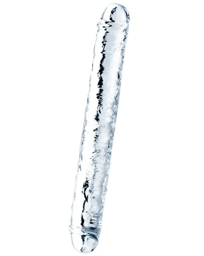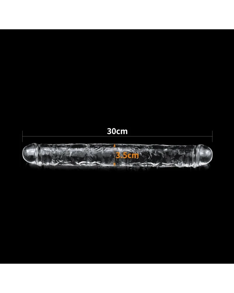 Ce sextoy transparent est un double gode conçu avec une longueur de 30cm et une largeur de 3.5cm.Il est idéal pour jouer en solo ou à deux.La surface est veinée et la structure est souple. Matière TPE