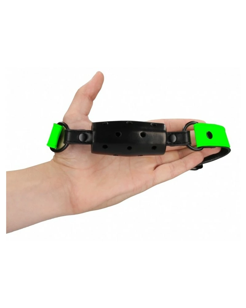 Ce bâillon phosphorescent de la gamme Glow in the dark est composé d’un bâillon perc鬆 en forme de cylindre (en PVC) avec une longueur de 7.5cm. La sangle en simili brille dans le noir. Elle est facilement ajustable. Cet accessoire apporte du fun et permet de renforcer la soumission du partenaire. Matière Polyuréthane