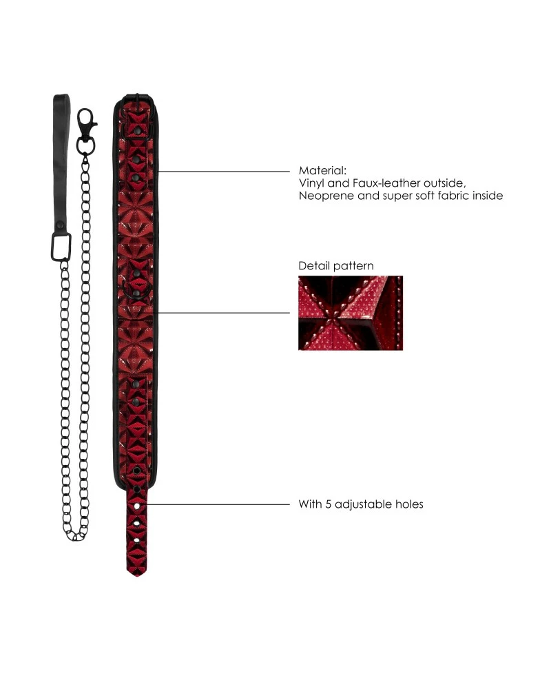 Cet accessoire de la marque Ouch! est composé d’un collier et d’une laisse en métal.Le collier possède une surface avec un relief croisé très élégant et la teinte rouge. La matière est le vinyle fin et brillant. Le collier a une largeur de 5cm et une longueur de 52cm, ajustable au tour de cou. La chaîne mesure 80cm de long