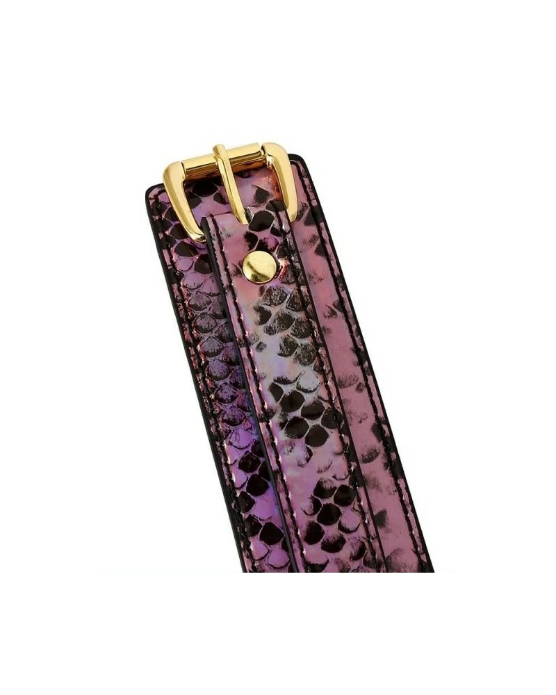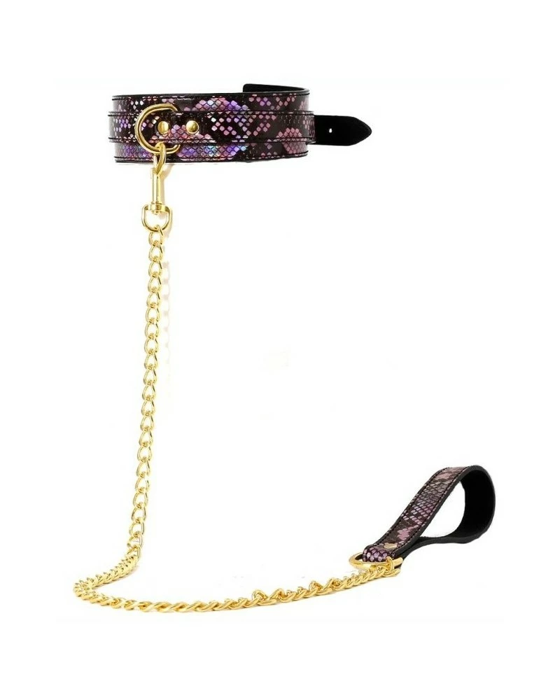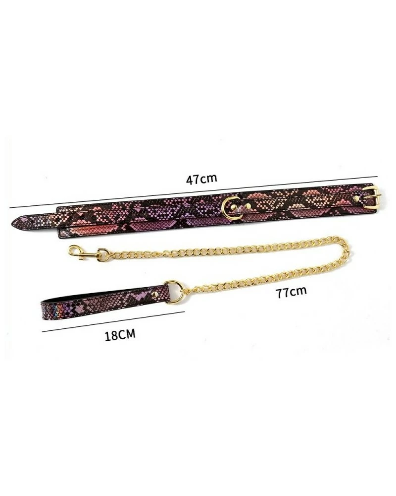 Le collier-laisse Snakine est un accessoire conçu avec une surface noir-rose et un style « peau de serpent ».Il a une largeur de 4cm. Le tour de cou va de 31 à 42cm. Avec la laisse en métal doré. Elle mesure environ 1 mètre. En polyuréthane