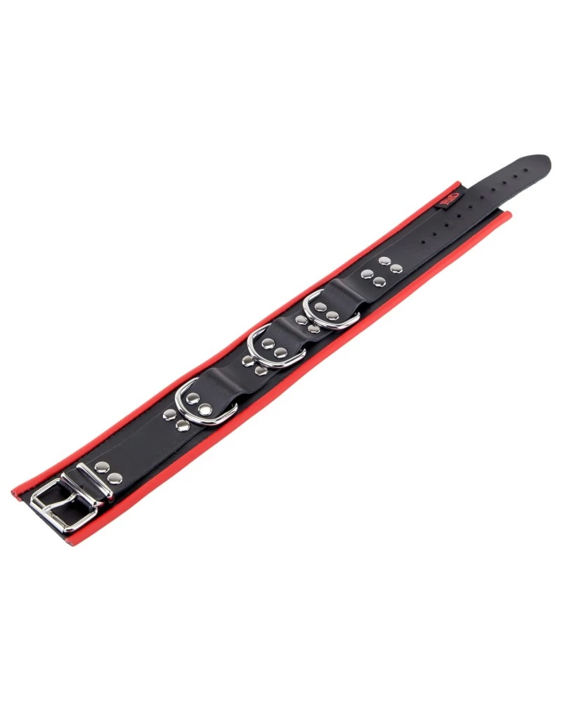 Ce collier en cuir de la marque The Red est un accessoire idéal pour les jeux SM.Il se compose d’une largeur de 6.5cm et d’une longueur de 46cm ajustable. Il couvre bien le cou et s’y ajuste facilement. Le collier est accompagné de 3 anneaux métalliques en forme de D