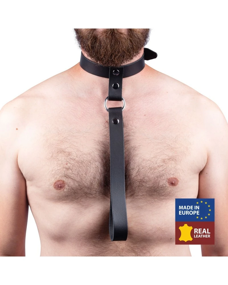 Ce collier en cuir est conçu avec une laisse courte et permet des jeux excitants.Le collier a une largeur de 2.5cm et un tour de cou allant de 35 à 49cm.La laisse mesure 30cm de longueur. En cuir véritable de vache. Tannage végétal.Fabriqué en Europe