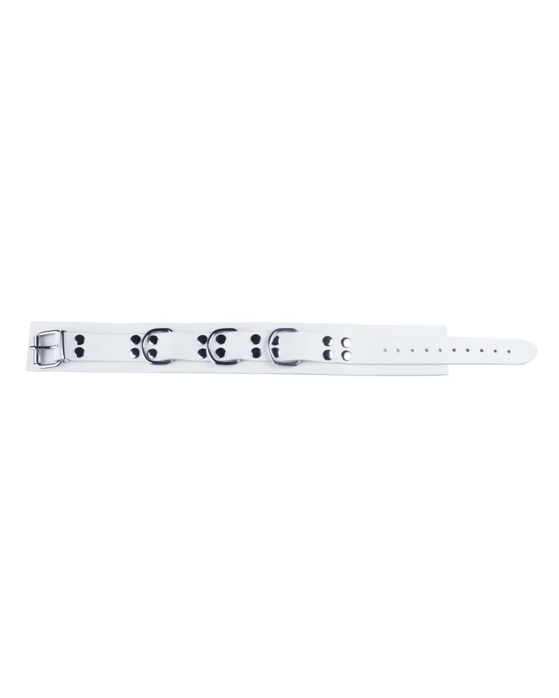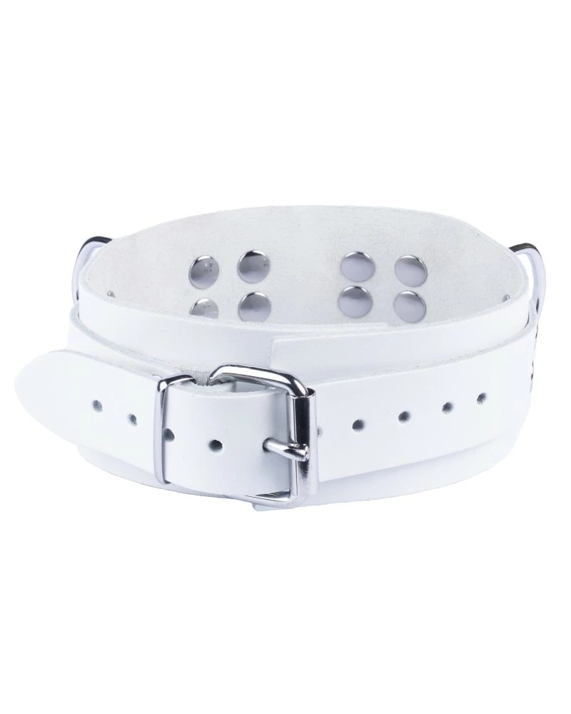 Le collier en cuir Ultra blanc est un accessoire conçu avec une largeur de 5.5cm. Les attaches, les rivets et les anneaux sont en métal.Il a un tour de cou de 38 à 52cm. Cuir véritable de vache. Tannage végétal.Fabriqué en Europe